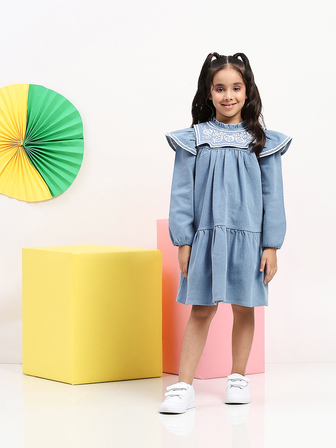 3. Chic Blue Denim Dress for Girls with Embroidered Yoke