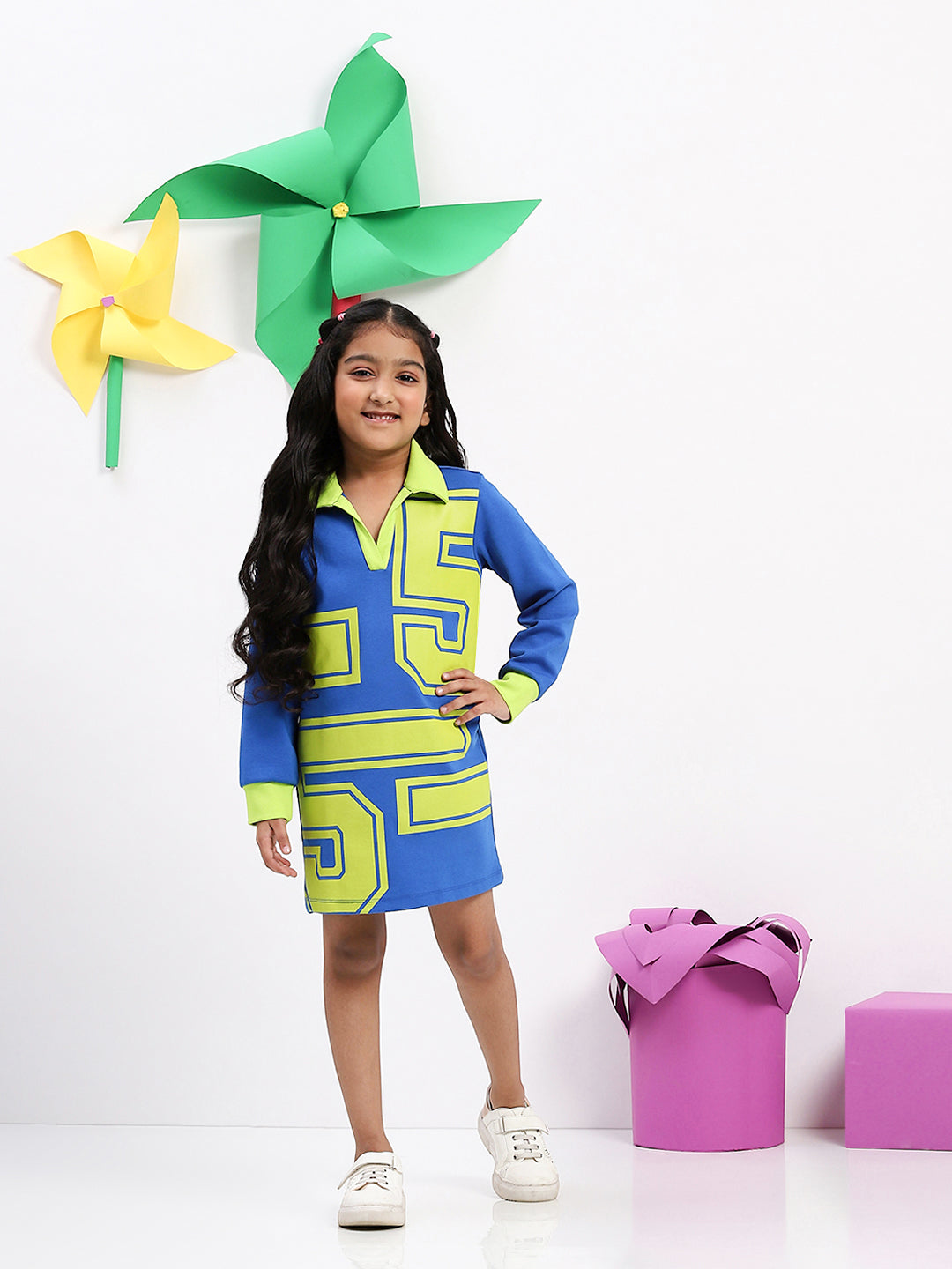 For a modern, chic vibe, this geometric print dress is the ultimate choice. The bold blue and green patterns exude playfulness, making it a stylish party wear dress for girls. This dress strikes the perfect balance between fashion and function, offering ease of movement for active party-goers. Add a pair of white sneakers for a trendy yet comfortable touch.