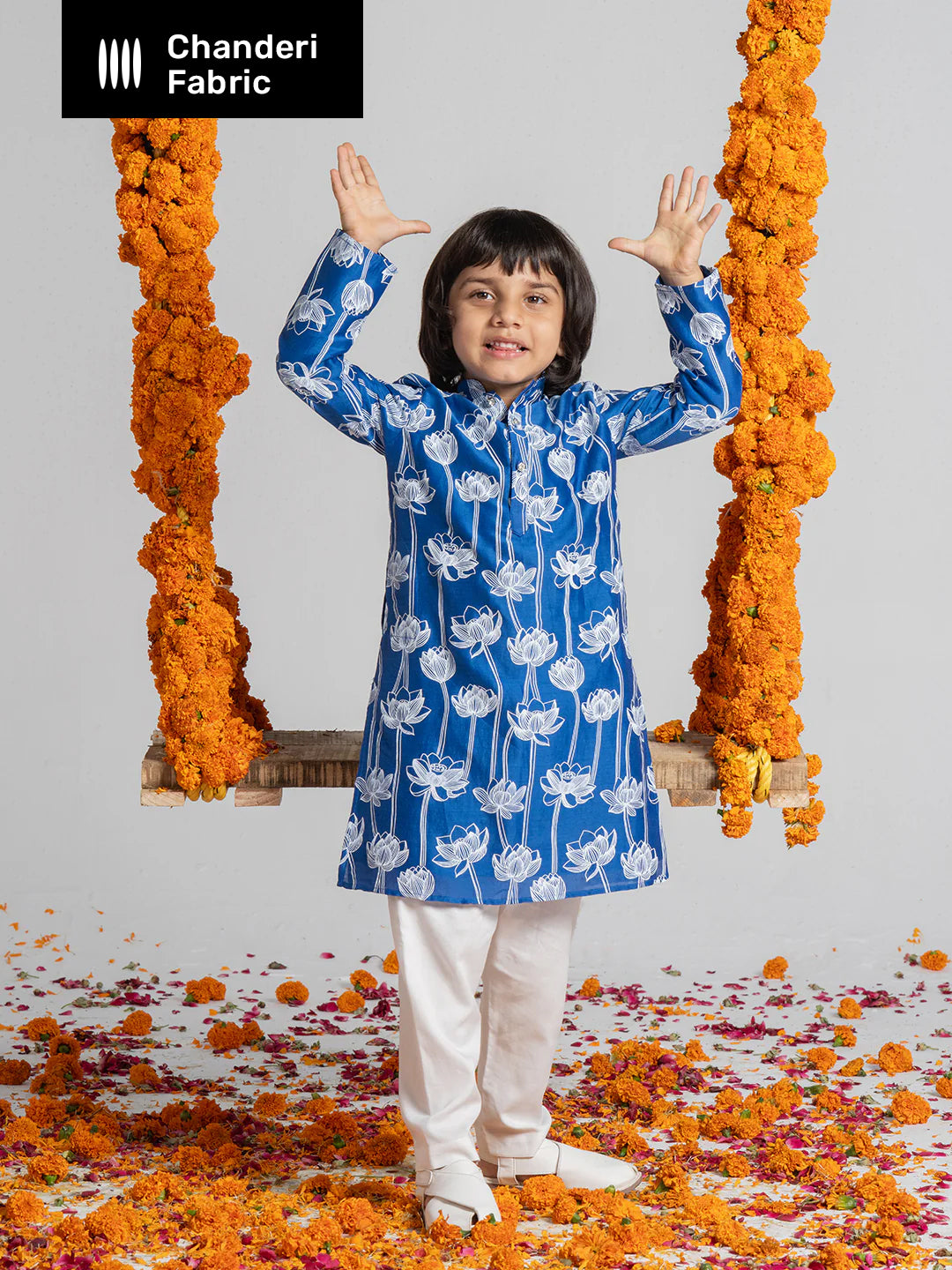 Boys Cotton Chanderi Cream Floral Printed Kurta Set
