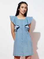 The dress is made from a durable denim fabric in a cool ice blue color, giving it a trendy and youthful look. It features fringed sleeves, adding a touch of bohemian style and movement to the garment. The fringes are typically made from the same denim material and are attached to the edges of the sleeves, creating a playful and fashionable detail.