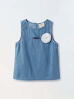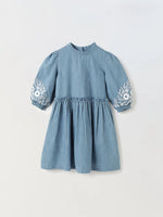 The Ice Blue Denim Fringed Sleeve Dress with Garfield Print is a fun and playful dress designed specifically for girls.