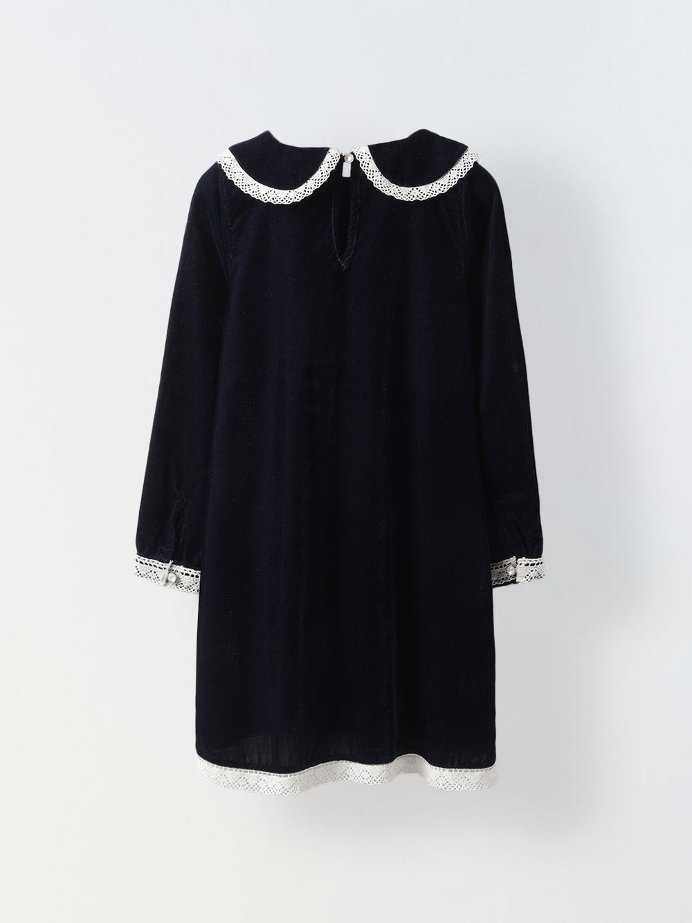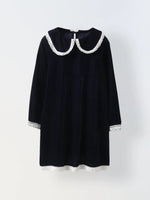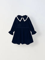 Girls Navy Velvet Party Dress with Lace Collar
