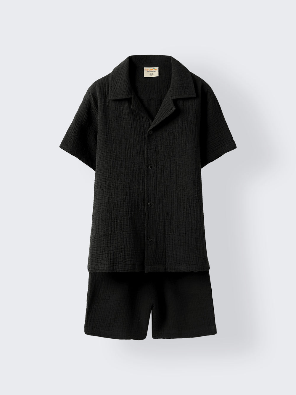 Introducing the plain Cotton Shirt & shorts Half Sleeves with Collar for Boys versatile ensemble perfect for any occasion. Made from cotton gauze, this set offers both comfort and style, making it suitable for casual wear, lounging at home, or just relaxing. The shirt features a classic button-down design with a stylish collar and trendy half sleeves, with its fresh colors and breathable fabric, this set keeps your child cool and comfortable all day long. Whether it's a day out with family, or simply loungewear at home, let them enjoy every moment with ease.